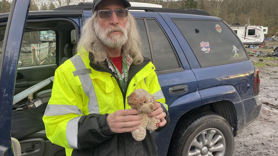 Meanwhile, Brad Davenport says he's keeping a stuffed teddy bear safe until he's able to wash it. It was a Valentine's Day gift to his late wife, which he was able to salvage from the destruction in his trailer.
