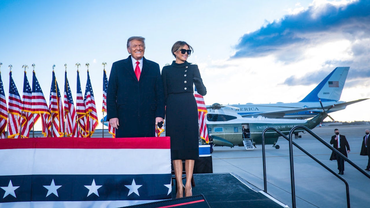 FILE - President Donald Trump and First Lady Melania Trump acknowledge supporters at Joint Base Andrews before boarding Air Force One for his last time as President on January 20, 2021 in Joint Base Andrews, Maryland.