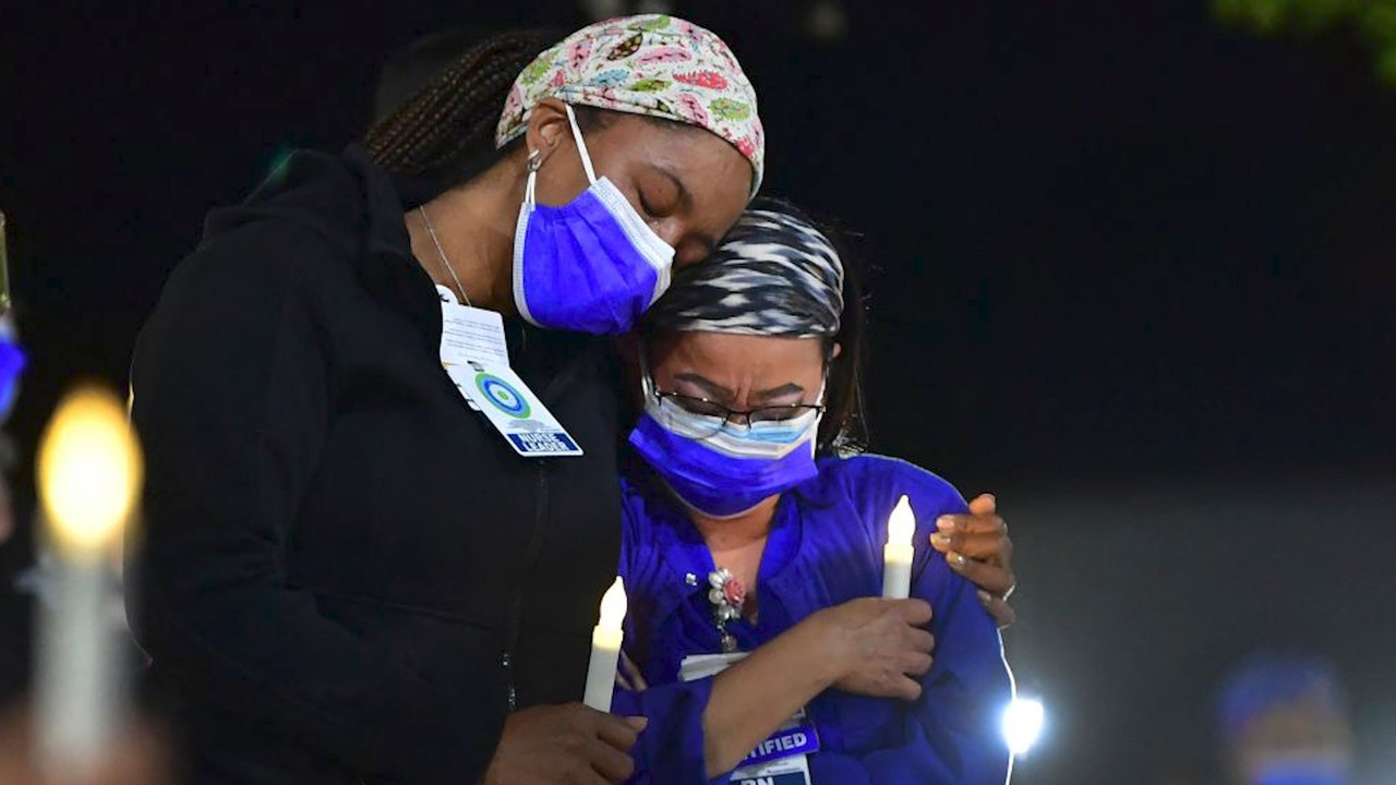 FILE - Registered nurses grieve and console one another during a candlelight vigil at Kaiser Permanente Hospital in Panorama City, California on April 28, 2021. (FREDERIC J. BROWN/AFP via Getty Images)