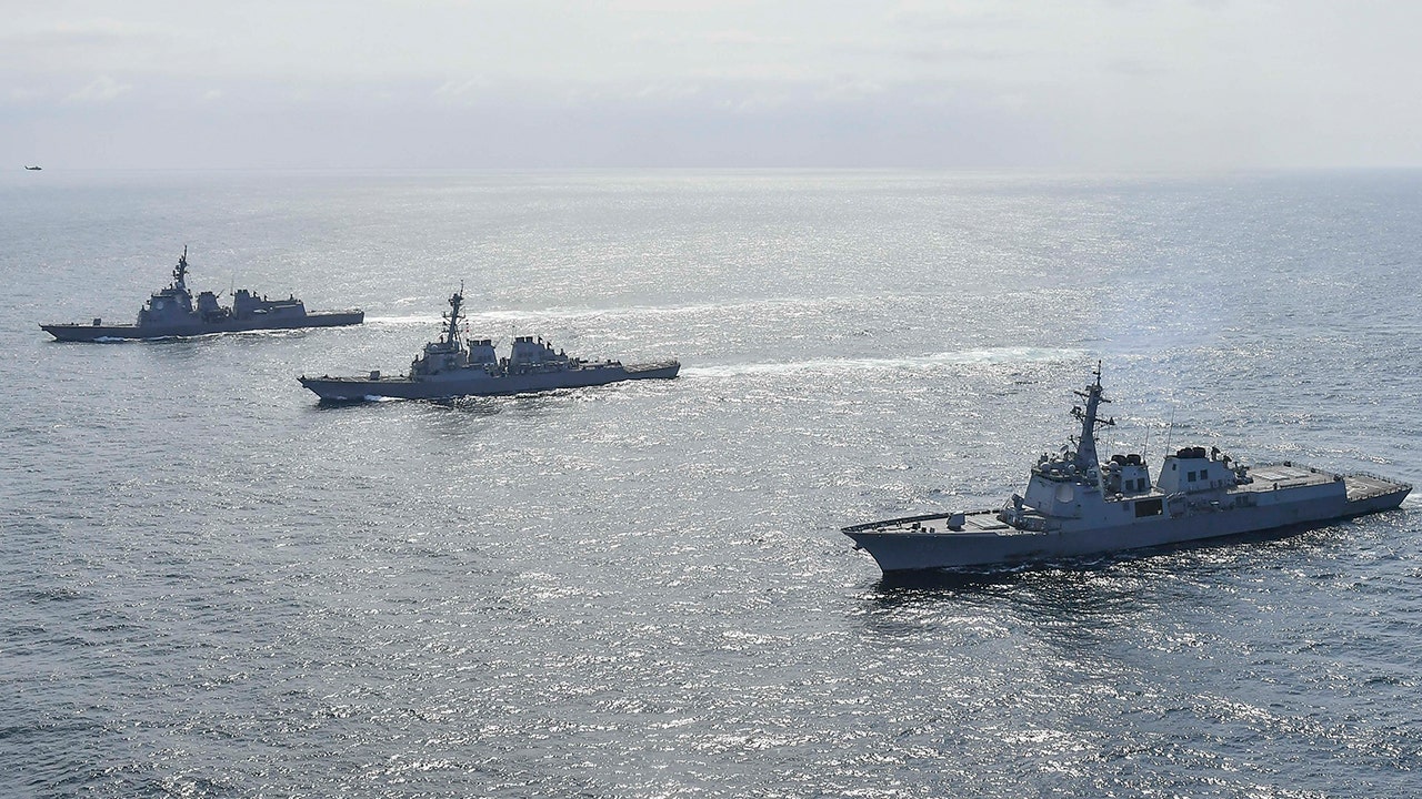 In this handout image released by the South Korean Defense Ministry, South Korean Navy's destroyer Yulgok Yi I (R), U.S. Navy's USS Benfold (C) and Japan Maritime Self-Defense Force's JS Atago (L) sail in formation during a joint naval exercise in in