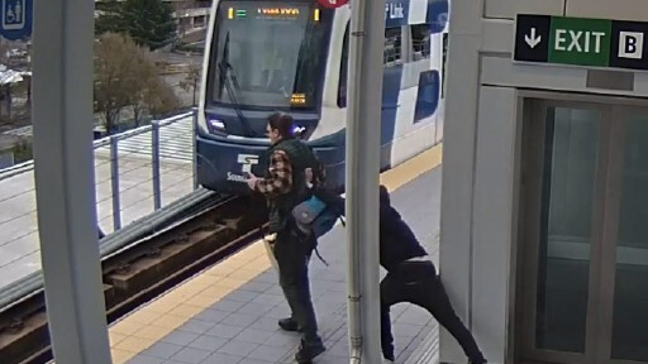 Surveillance video captures the moment before a man, suspected to be Elisio Melendez, pushing the victim as a train approaches the platform at the Northgate light rail station in Seattle.