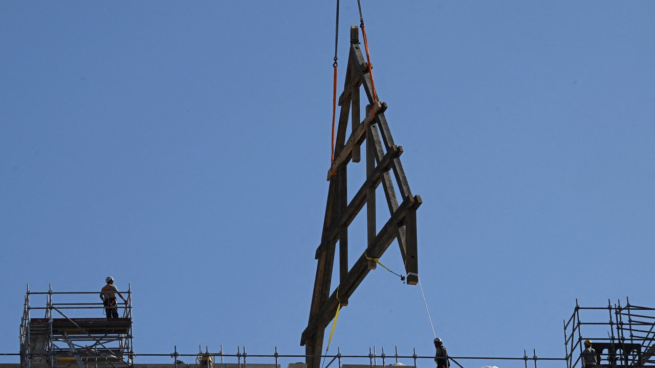 Cranes hoist massive oak trusses onto Notre Dame Cathedral 4 years after fire