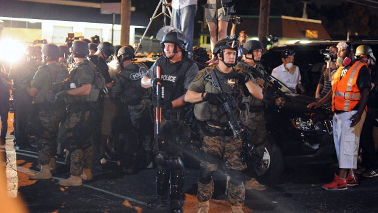 Police officers stand on alert as a peaceful protest escalates between police and protesters along a street in Ferguson, Missouri on August 19, 2014.