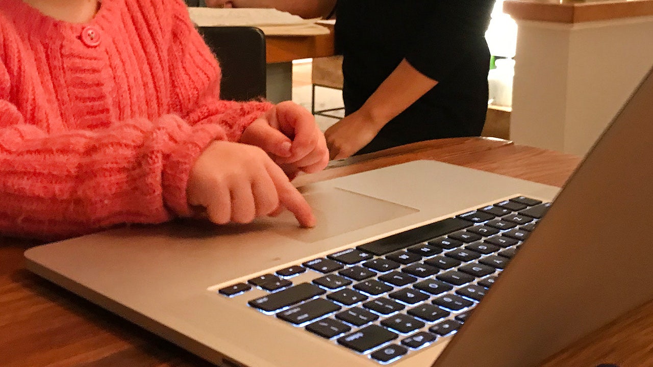 A three year old girl playing on her mothers Apple Mac Book Pro computer as her mother works with a notebook and pen in the background in their home in Madison, Connecticut, 4th December 2017. Photo by Tim Clayton/Corbis via Getty Images)