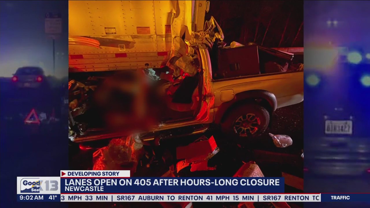 All northbound lanes of I-405 in Newcastle are back open after an hours-long closure that created a six-mile backup on Monday. Authorities say a pickup truck rear-ended a stopped semi on the highway, sending both occupants of the vehicle to the hospital with life-threatening injuries.