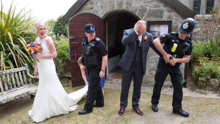 ISLES OF SCILLY — A photo of a newly married man being escorted away from his bride by police has gone viral across social media.