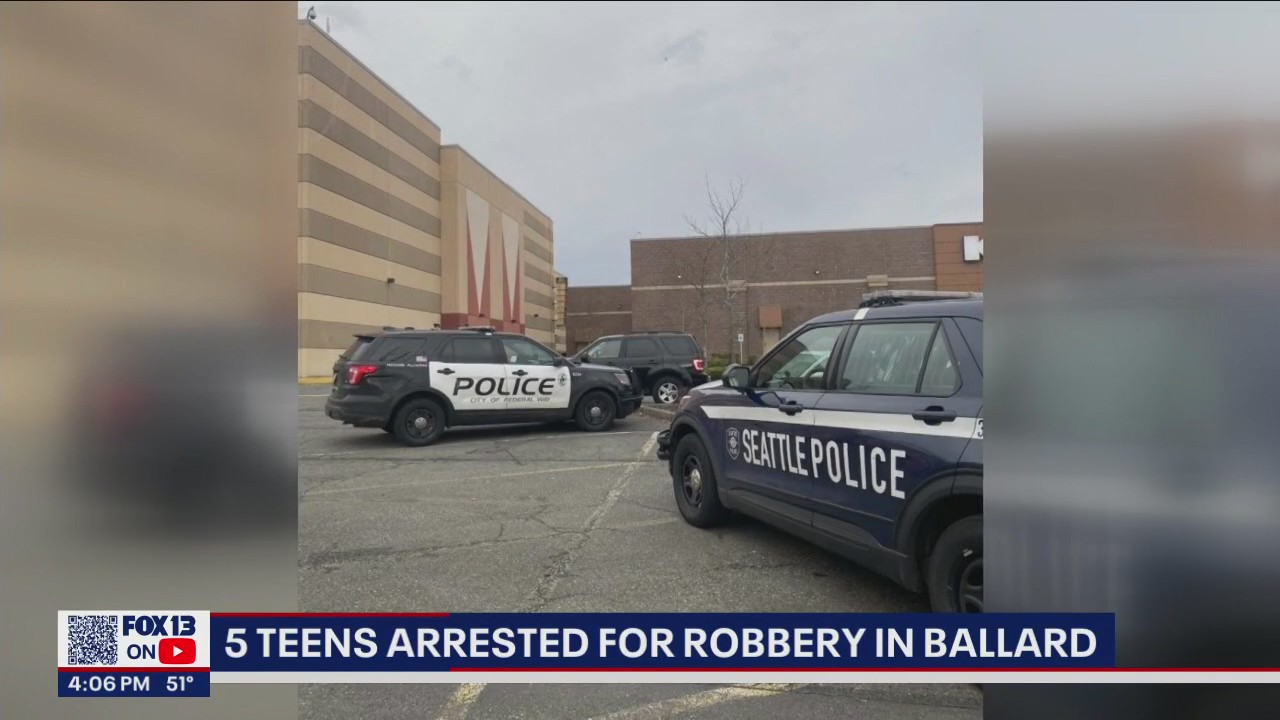 SEATTLE - Five teen boys were arrested on Thursday after they allegedly robbed a man in Ballard, fled to Federal Way in stolen vehicles and then tried to shake police inside a mall.