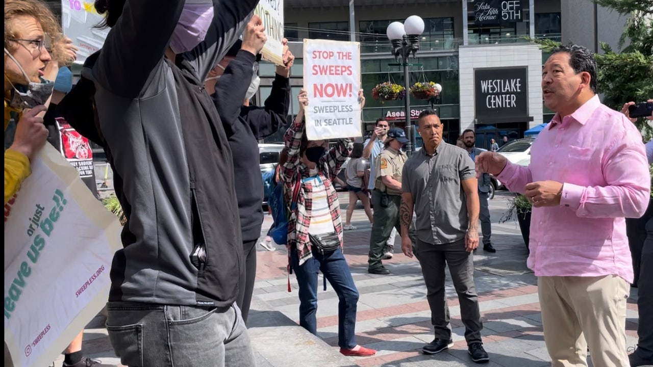 SEATTLE - To the tourist bus driving by Westlake Park, the scene must have been confusing: Seattle Mayor Bruce Harrell on-stage surrounded by dozens of city employees hyping a much-anticipated "activation plan" as protestors tried to shout over his speaker system chanting, "Stop the sweeps!"