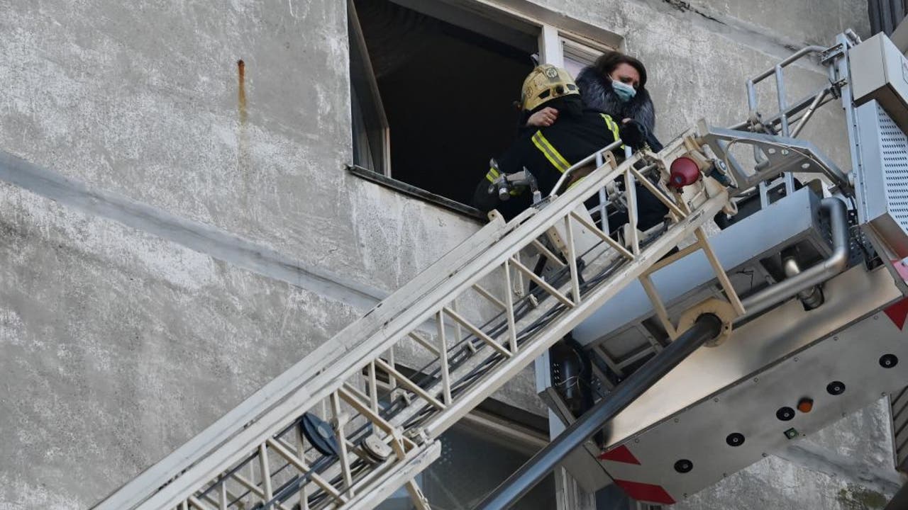 Residents are evacuated by firefighters from a burning 16-story residential building in Kyiv on March 15, 2022, after strikes on residential areas killed at least two people, Ukraine emergency services said as Russian troops intensified their attacks