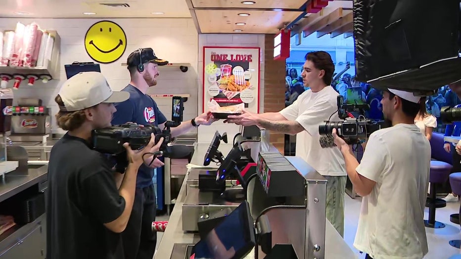 Sam Darnold working at Seattle's Raising Canes in the University District. (FOX 13 Seattle)