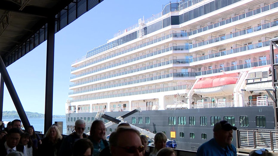 SEATTLE - Holland America Line kicked off its Alaska cruise season on Saturday with a celebration. As the sweet sounds of the University of Washington alumni band floated through the air, FOX 13 captured people of all ages with their suitcases in hand, boarding the ship.