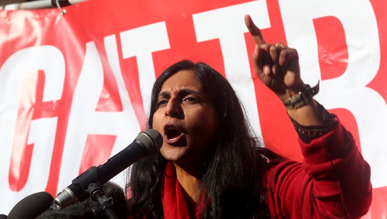 SEATTLE, WA - Seattle City Council member Kshama Sawant speaks at a rally held outside the U.S. District Court for the Western District of Washington. (Photo by Karen Ducey/Getty Images)