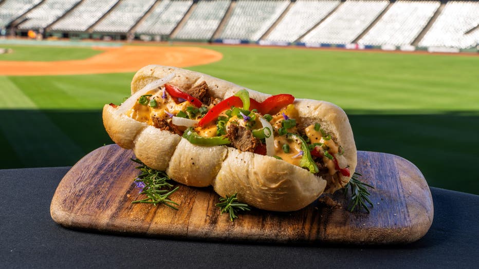 A plant-based twist on the ballpark classic, featuring pulled oat protein, peppers, onions, and a cashew-based "cheese sauce". (Sec. 146)