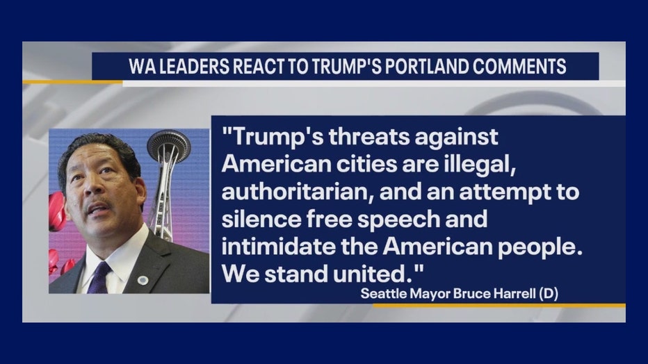 Seattle Mayor Bruce Harrell says he has spoken with Portland's mayor, offering support to the city. Harrell described Trump's threats as illegal and authoritarian, aimed at silencing free speech and intimidating the American people.