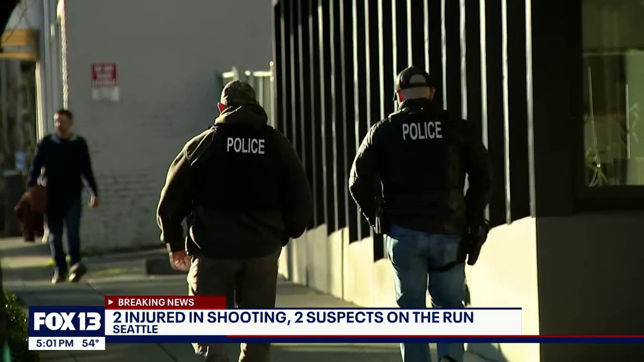 Two people were injured and two suspects are on the run following an apartment shooting in Seattle Tuesday afternoon.