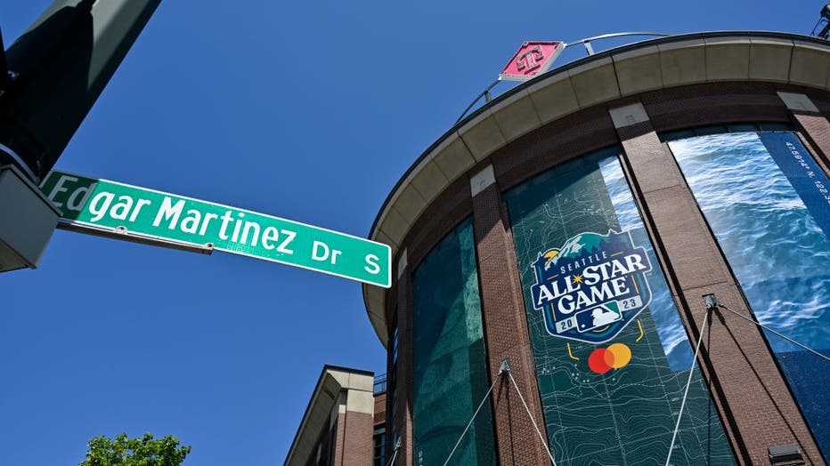 SEATTLE, WASHINGTON - JULY 01: A view of the 2023 MLB Seattle All-Star Game signage at T-Moble Park located on Edgar Martinez Dr before the game between the Seattle Mariners and the Tampa Bay Rays at T-Mobile Park on July 01, 2023 in Seattle, Washing