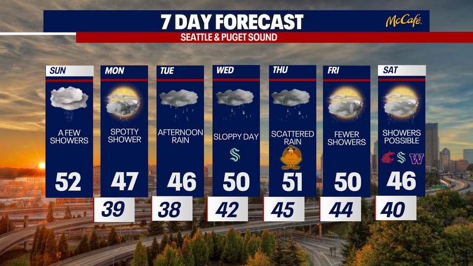 SEATTLE - Following the on-and-off rain Sunday, there will be a break with stabilizing conditions. This will change heading into the workweek with wet conditions across the Puget Sound region, including mountain snow and an atmospheric river.