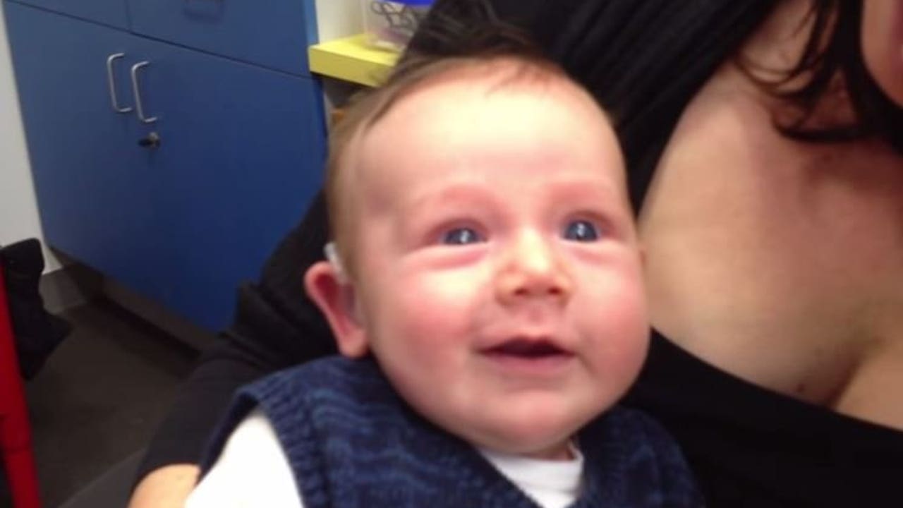 A video posted on YouTube shows a 7-week-old boy hearing for the first time using his new hearing aids.