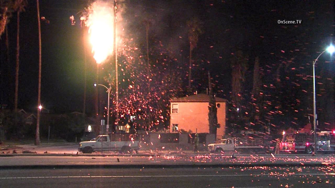 LOS ANGELES -- A palm tree burst into flames on Christmas morning sending embers flying down the street as high winds whipped across southern California.