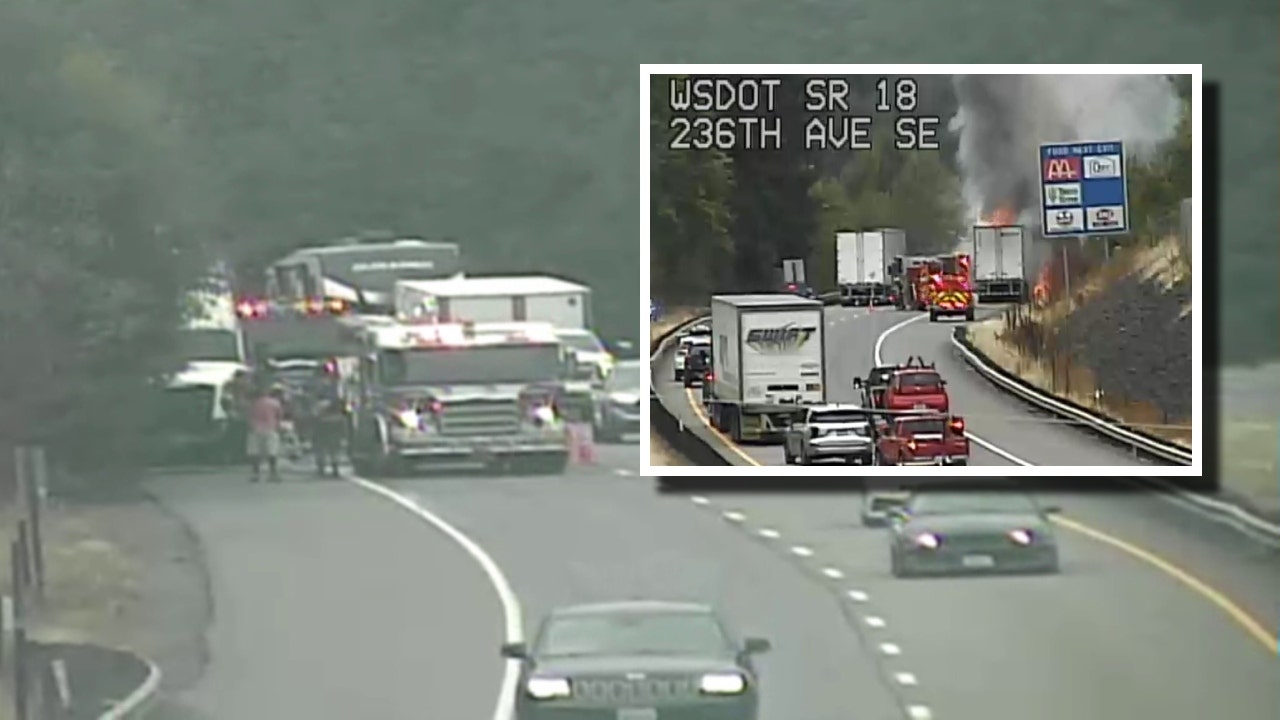 MAPLE VALLEY, Wash. - A semi-truck caught fire in Maple Valley on Saturday, causing traffic backups, lane closures, and a small, nearby brush fire.