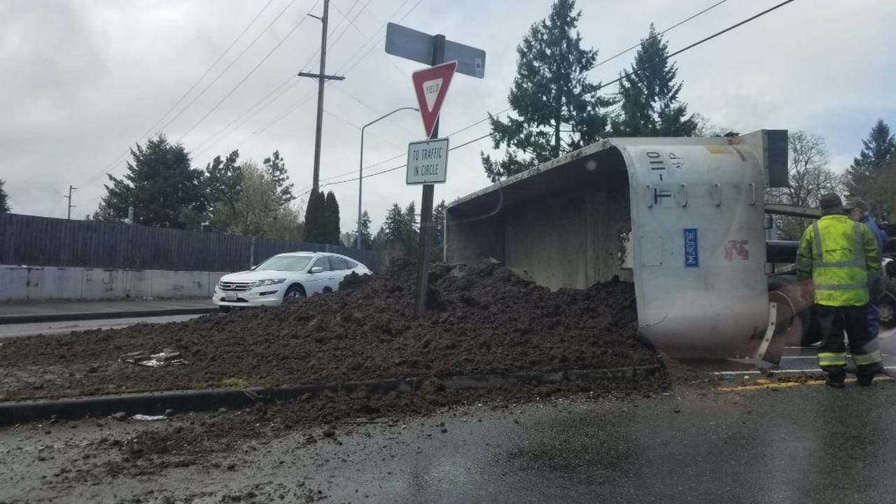 Semi-truck carrying manure overturns in Lacey