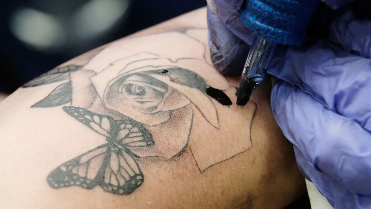 FILE - An artist tattoos someone's arm.