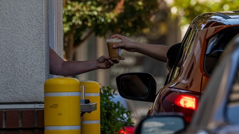 An employee hands a drink to a customer at the drive-thru of a Starbucks coffee shop in Hercules, California, on Thursday, July 28, 2022. (Photographer: David Paul Morris/Bloomberg via Getty Images)