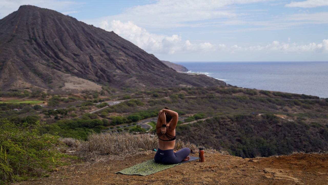 From a hiking trail overlooking Hanauma Bay with Koko Head in the background Jessica Linster, 24, of Kahala, stretches after morning yoga in Hawaii. (Photo by Kent Nishimura/Los Angeles Times via Getty Images)