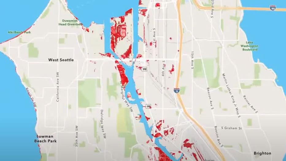 Flooding is a major concern for this part of Seattle. Looking at the city's sea rise projection map, you can spot the areas expected to see community-level impacts from various levels of coastal flooding and rising sea levels. The darker the red, the worse it's expected to be.