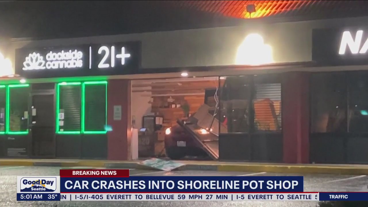 A pot shop in Shoreline was damaged after a car crashed into the entrance.
