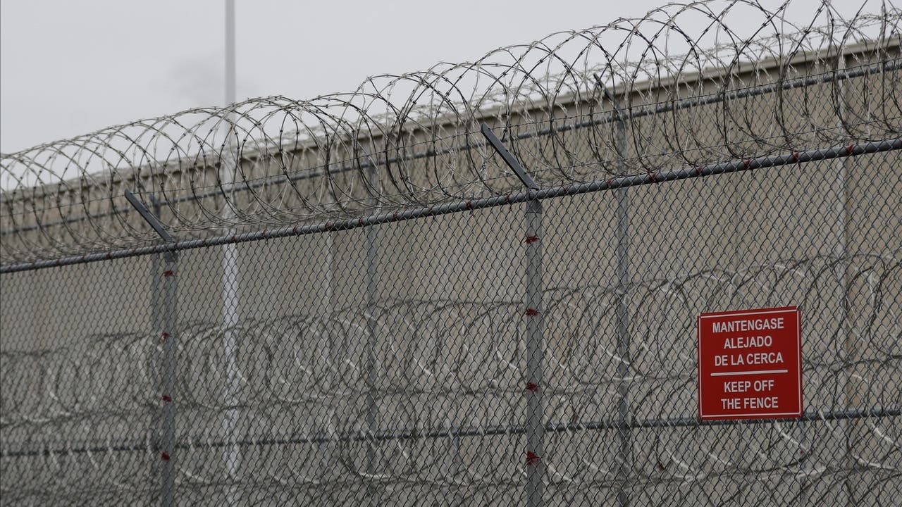 FILE - Barbed wire fencing is shown behind a sign in English and Spanish in a recreation yard used by detainees during a media tour of the U.S. Immigration and Customs Enforcement detention center, Dec. 16, 2019, in Tacoma, Wash. (AP Photo/Ted S. War