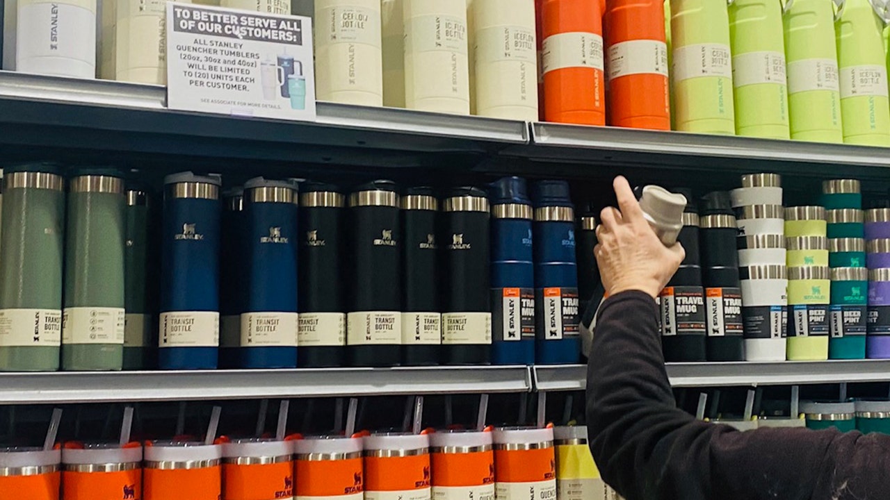 A man shops for Stanley cups and water drinking bottles from a fully-stocked supply at a sporting goods store in Pasadena, California, on January 24, 2024. (Credit: FREDERIC J. BROWN/AFP via Getty Images)
