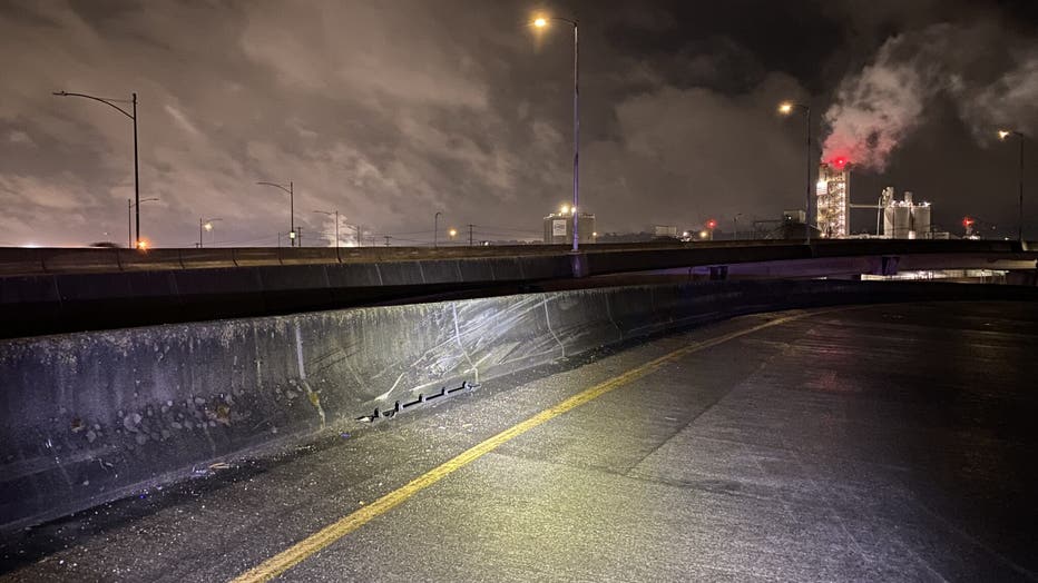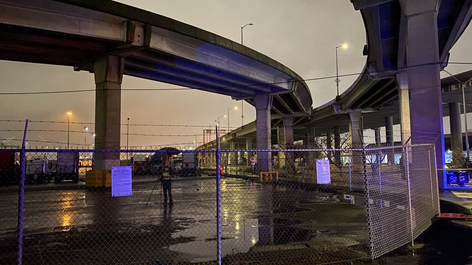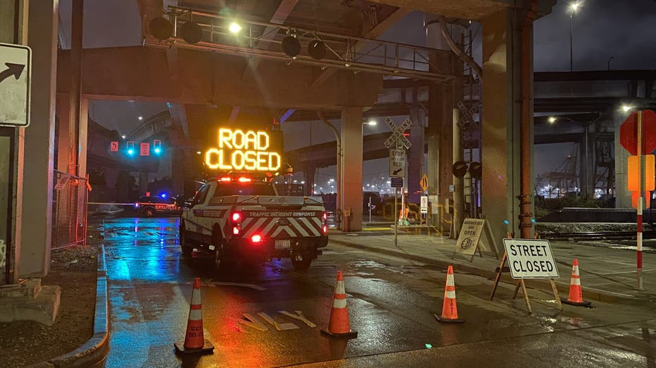 Seattle authorities close off the roadway near South Spokane Street in SODO as they respond to a crash site on Oct. 19