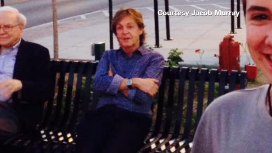 On Sunday night, Murray, 16, took a photo of his friend Tom White on an Omaha, Neb., sidewalk -- standing in front of Warren Buffett and Paul McCartney as the two men sat casually on a bench in the background. White tweeted the image, and by Monday it had gone viral.