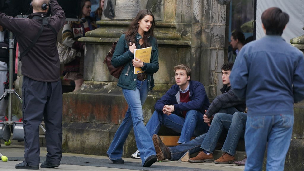 Actress Meg Bellamy, who plays Kate Middleton, and actor Ed McVey, who plays the part of Prince William, film scenes for the next season of The Crown in St Andrews in Scotland. Picture date: March 17, 2023. (Photo by Andrew Milligan/PA Images via Get