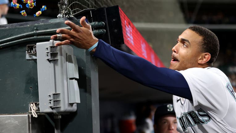 SEATTLE, WASHINGTON - APRIL 18: Julio Rodriguez #44 of the Seattle Mariners tosses bubblegum against the Milwaukee Brewers at T-Mobile Park on April 18, 2023 in Seattle, Washington. (Photo by Steph Chambers/Getty Images)