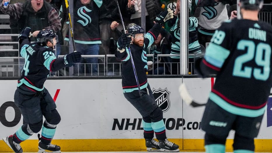 SEATTLE, WASHINGTON - APRIL 08: Adam Larsson #6 of the Seattle Kraken celebrates after scoring a goal during the second period of a game against the Chicago Blackhawks at Climate Pledge Arena on April 8, 2023 in Seattle, Washington. (Photo by Christo