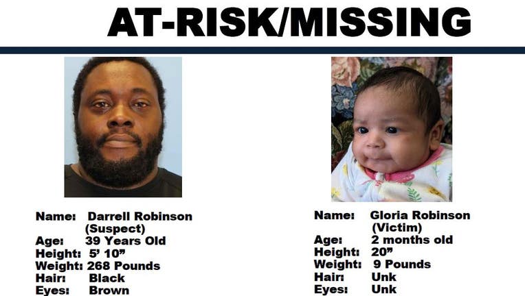 Robinson is described as 5'10" and weighs around 268 pounds. He has black hair and brown eyes. His child's name is Gloria Robinson, and she's a two-month-old who is 20 inches long and weighs nine pounds. She was last seen wearing a onesie with foot pajamas.
