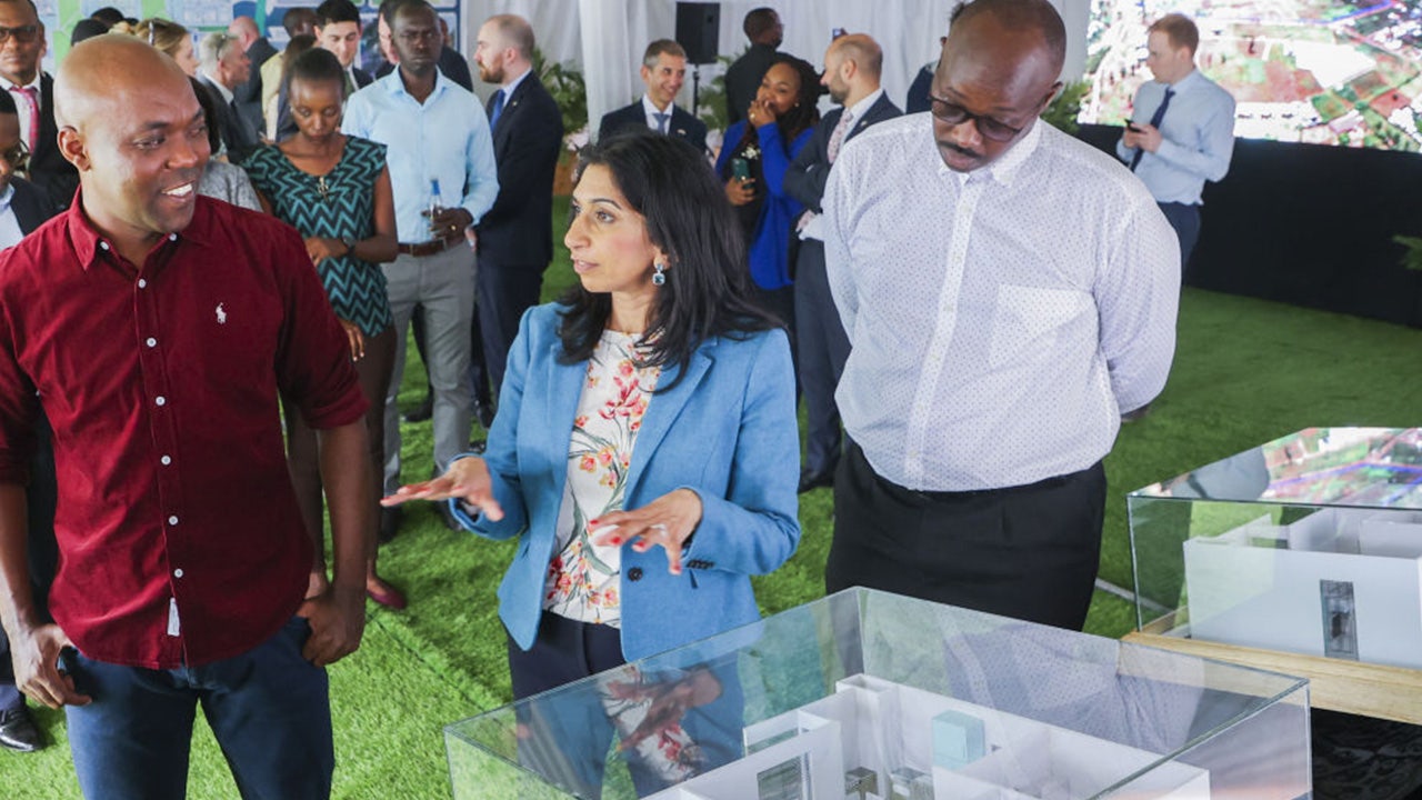 FILE - British Home Secretary Suella Braverman (C) and Rwandan Infrastructure Minister Ernest Nsabimana (L) attend the groundbreaking ceremony of houses to be built for illegal migrants in Kigali, Rwanda on March 19, 2023. (Cyril Ndegeya/Anadolu Agency via Getty Images)