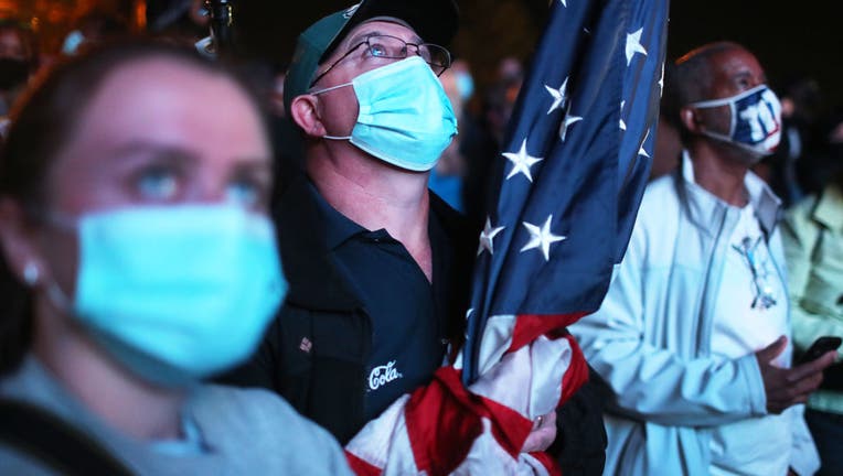 FILE - Liam Burns (C) listens as President-elect Joe Biden addresses the nation at the Chase Center on November 07, 2020 in Wilmington, Delaware.