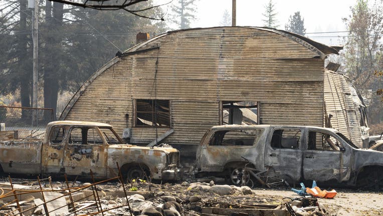 Burnt vehicles sit parked in front of a warehouse destroyed by wildfires in Gates, Oregon, U.S., on Sunday, Sept. 20, 2020. Wildfires have burned nearly 5 million acres, killed at least 27 people, and forced hundreds of thousands to evacuate up and d