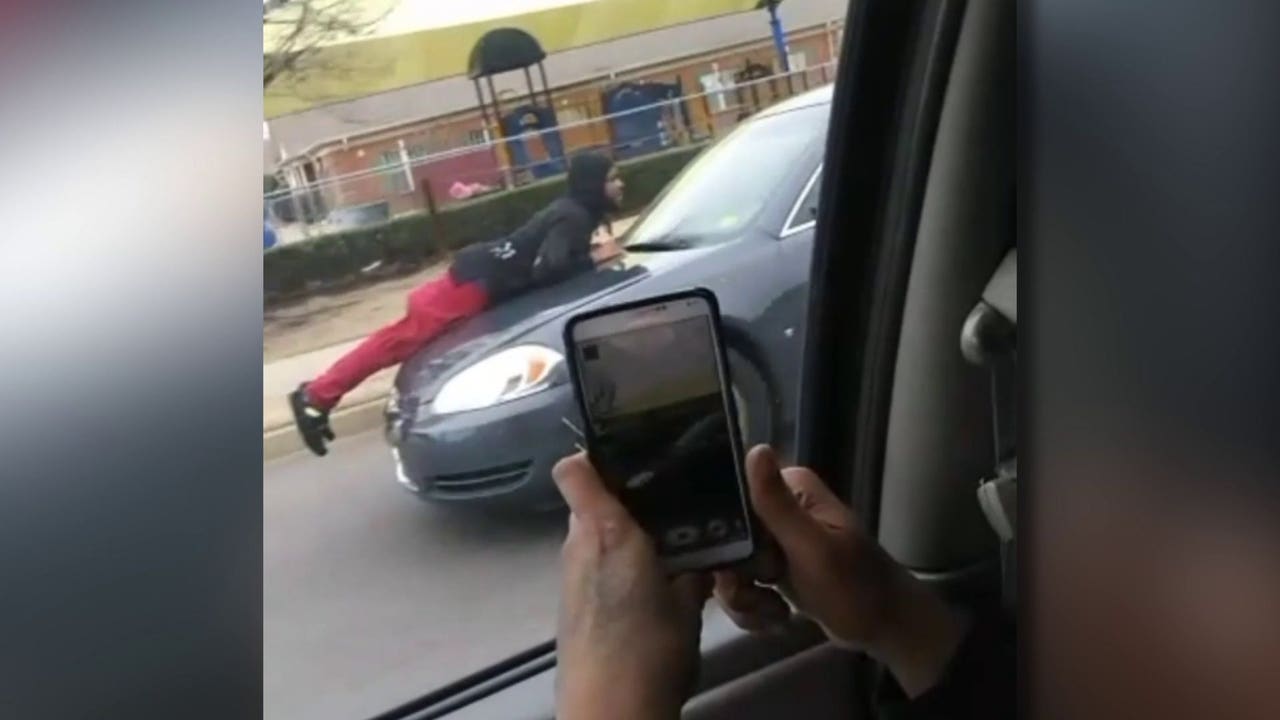 But Pittman said the man didn't move and was lifted onto the hood as the woman began driving away. As she gathered speed, he continued to cling on.