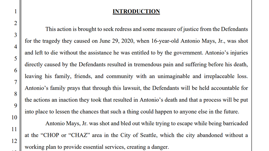 It also states that the teen "was shot and bled out while trying to escape, while being barricaded at the ‘CHOP’ or ‘CHAZ’ area in the City of Seattle, which the city abandoned without a working plan to provide essential services, creating a danger."