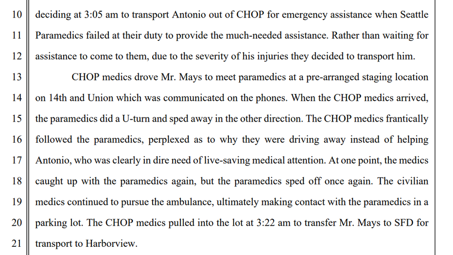 The lawsuit goes on to state it was "CHOP medics, who were essentially good Samaritans, attempted to provide aid, deciding at 3:05 a.m. to transport Antonio out of CHOP for emergency assistance," rather than Seattle paramedics.
