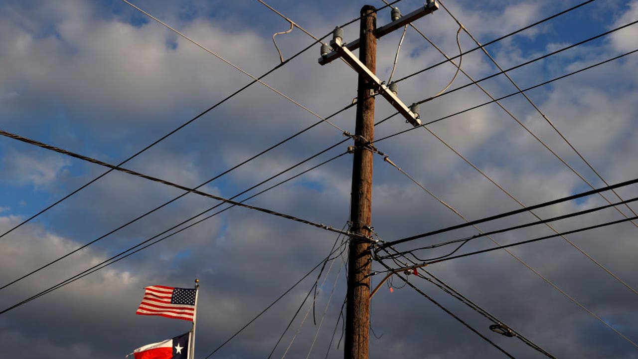 The U.S. and Texas flags fly next to a power pole on Feb. 21, 2021 in Houston, Texas. (Photo by Justin Sullivan/Getty Images)