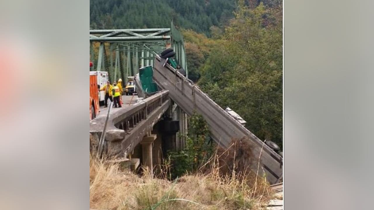 Truck hangs off bridge in Oregon. (Photo: Oregon State Police via KPTV/Portland)