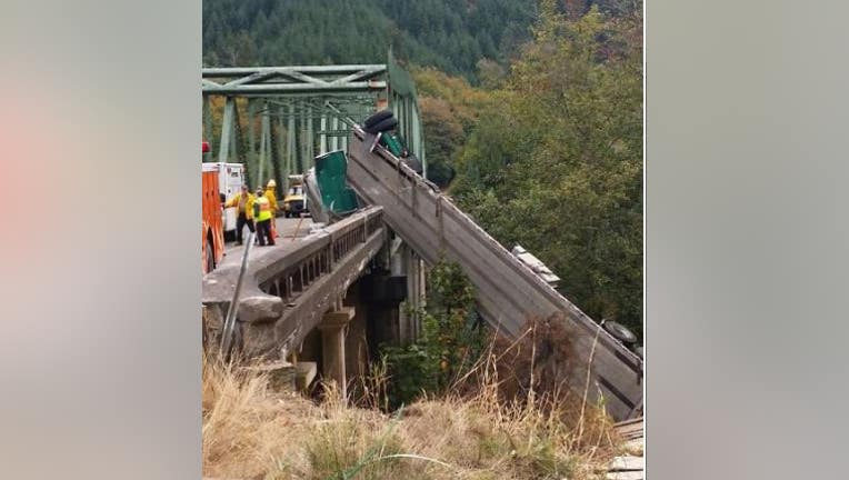 REEDSPORT, Ore. -- A truck pulling a flatbed semi loaded with lumber crashed through a guardrail and went over a bridge railing, leaving the truck and trailer partially hanging off the bridge over the Umpqua River near Reedsport, Ore., KPTV in Portland reported Thursday.