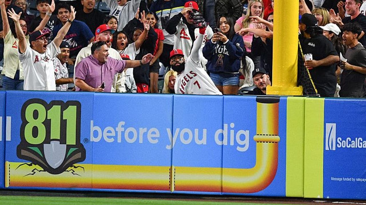 ANAHEIM, CA - APRIL 04: Los Angeles Angels outfielder Jo Adell (7) falls into the stands after he robbed his third home run of the game in the 9th inning of the MLB game between the Seattle Mariners and the Los Angeles Angels on April 4, 2026 at Ange (Brian Rothmuller / Icon Sportswire / Getty Images)
