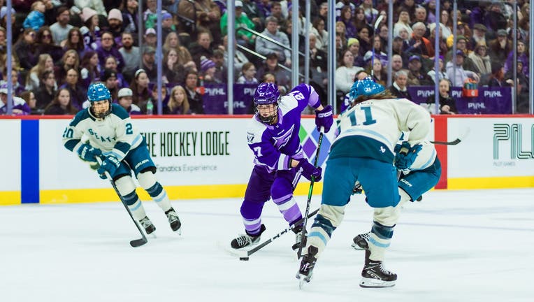 ST. PAUL, UNITED STATES - MARCH 13: Minnesota Frost forward Taylor Heise cuts through Emily Brown (No. 11) and Mariah Keopple (No. 20) of the Seattle Torrent in a PWHL hockey game on March 13, 2026. (PWHL)