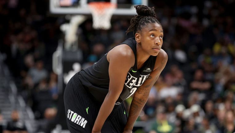 SEATTLE, WASHINGTON - MAY 20: Jewell Loyd #24 of the Seattle Storm looks on during the third quarter against the Las Vegas Aces at Climate Pledge Arena on May 20, 2023 in Seattle, Washington. (Photo by Steph Chambers/Getty Images)